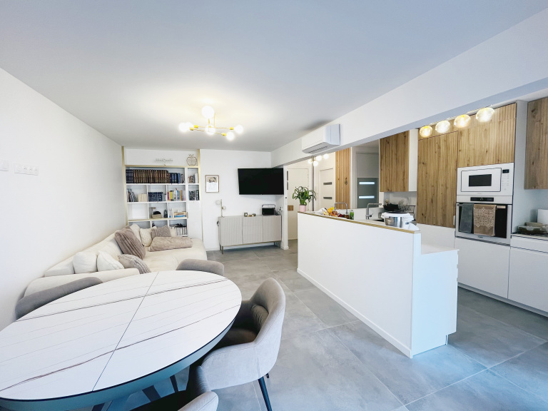 Séjour de 30 m2 avec cuisine américaine équipée,baigné de lumière grâce à son exposition plein Sud, il offre une terrasse ensoleillée sans vis-à-vis, idéale pour profiter du soleil azuréen.